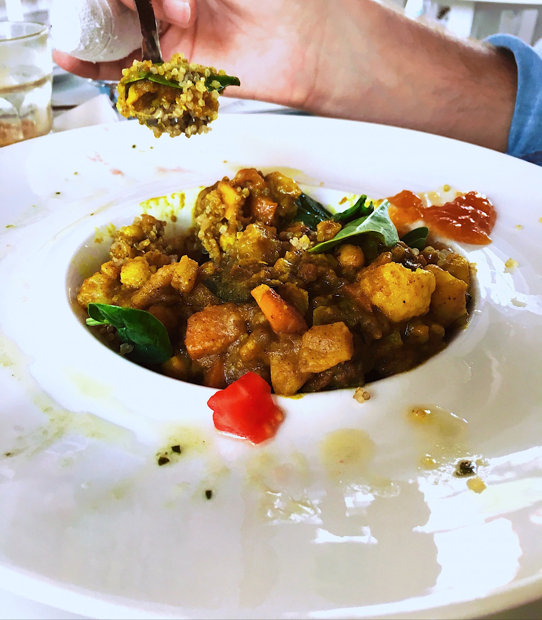 Szerencsére szerelmespárom azt az ételt választotta, amit mindenképp megszerettem volna kóstolni, az pedig az indiai. Szerintem az indiai fűszerezés páratlan és nagyon szeretem, itt is mennyei volt. A Veganeeta különlegesség pedig abban rejlett, mint Anitától megtudtuk, hogy megspékelte mazsolával. A tányér szélén pedig díszítésként baracklekvár volt, ami hihetetlenül jól passzolt az ételhez.