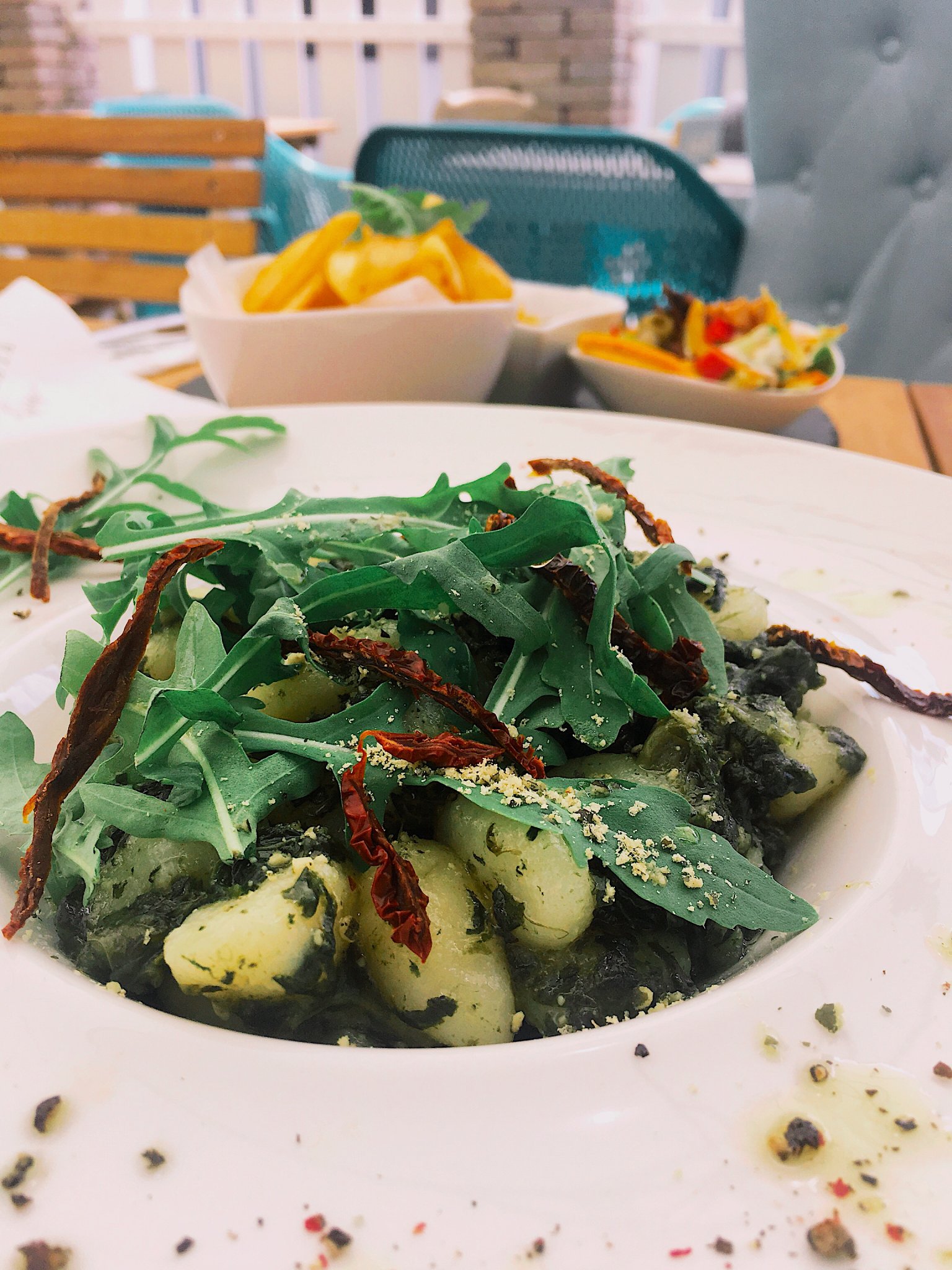 Na de, nincs vége még! Nem bírtuk ki, hazafelé is benéztünk, ki tudja mikor kanyarodunk újból Balatonalmádi felé, inkább még egy alkalommal rögzítettük a hely atmoszféráját magunkban. Ezúttal főételként házilag gyúrt gnocchikat választottam spenótos feltéttel, ami olyan kellemesen fokhagymás, mediterrán ízvilágot nyújtott, és amit nagyon imádtam, a szárított paradicsom csíkok rajta, tökéletes délelőtti ebéd volt!