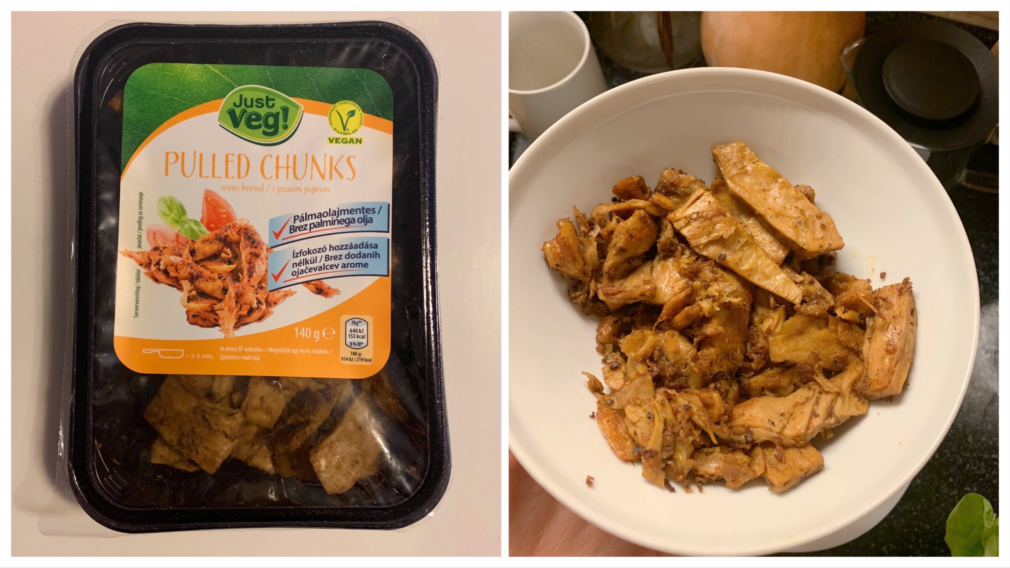 Az Aldi eddig is, de az utóbbi időben nagyon ráerősített a vegan vonalra, külön megemlíteném a croissantot, ami nagyon finom. Pár hónapja pedig elkezdtek megjelenni időszakosan a húsra hasonlító, de teljesen növényi élelmiszerek. Ezek közül már több is be van tárazva nálam, amit legelőször kóstolunk az az úgynevezett Pulled Chunks, ami a tépett húst takarja.